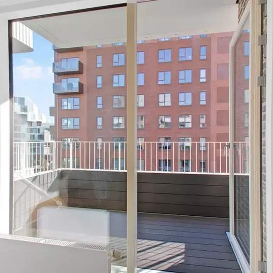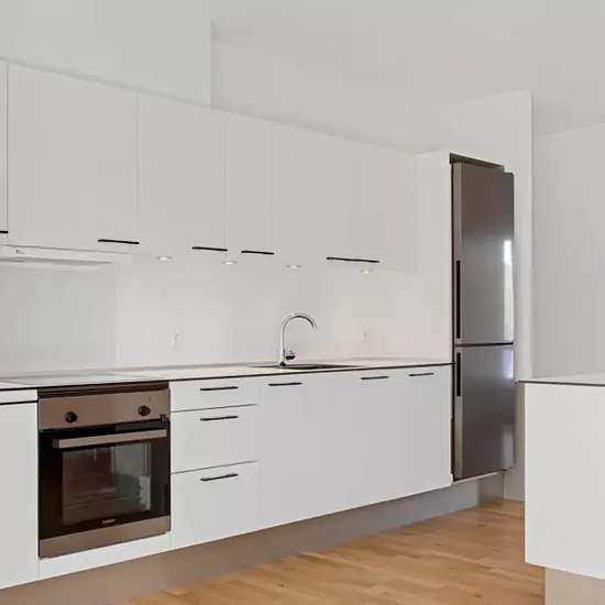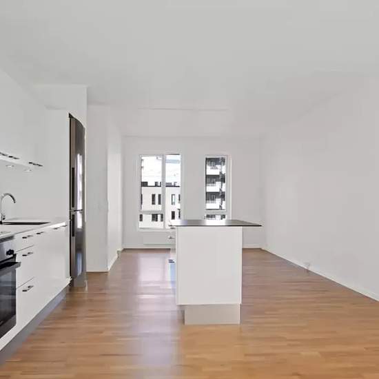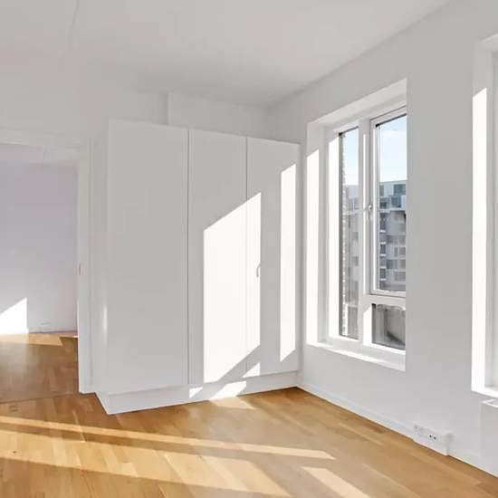 The apartment The apartment is laid out with a large open-plan room where the kitchen and living room merge to create a spacious atmosphere. The large window sections draw light into the apartment from all angles. In addition, the home is equipped with a modern kitchen from Invita, appliances from Bosch Siemens, and practical closet space in the master bedroom. From the hallway you have access to the spacious and inviting bathroom with underfloor heating, molded marble sink, wall-mounted toilet, and a washer-dryer stack. From the living room...