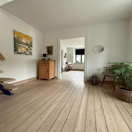 Close to the centre, shopping options, a gymnasium, the train and bus station etc., we find a super lovely 4-room apartment of a full 137 m². The apartment is located on the 2nd floor in a quiet stairwell with a total of six apartments. The apartment is laid out with a large entrance/hall with a staircase to the upper floor, a cozy living room, a good large kitchen with hob, extractor hood, built-in oven, fridge/freezer and dishwasher; from the kitchen area there is a half wall to a nice dining area, and there is also a small pantry. The ent...