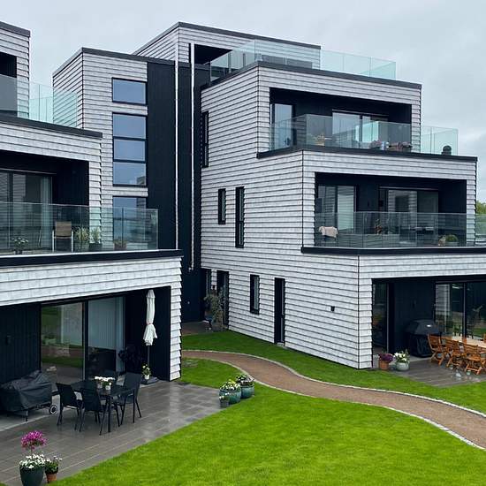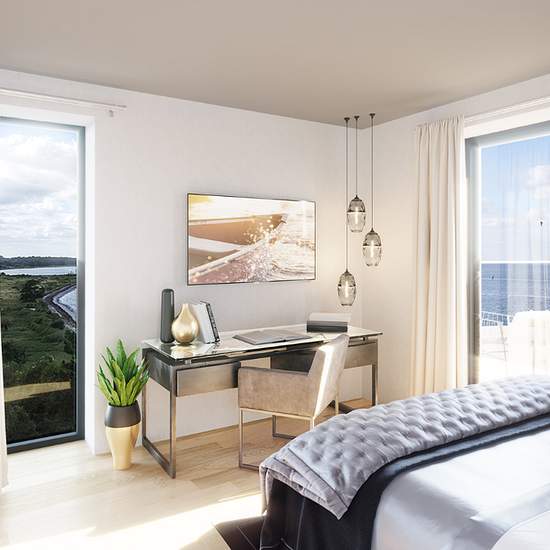 Exclusive apartment with sea views and first-class materials. You step into a bright entrance hall with further access to the apartment’s large and bright kitchen-dining area with a large kitchen island and plenty of cupboard space, a dining area as well as a good living room with access to the property’s terrace or balcony. Furthermore there is a bedroom adjoining a walk-in and its own bathroom, two rooms as well as a storage room with a wall of cupboards and an additional bathroom. Garden: Private terrace Outbuildings: Storage room, 5 m²...