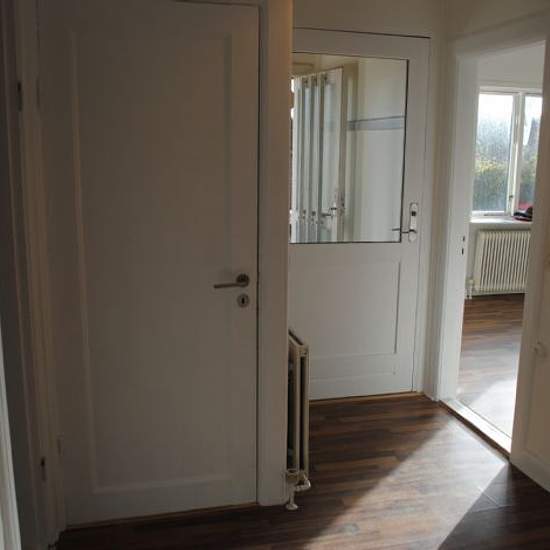 GROUND-FLOOR APARTMENT IN VILLA: 105 m2. Arranged with a spacious entrance hall with access to a toilet and a bright living room with a wide folding door to the dining room, from which there is access to a kitchen with ceramic stove, extractor hood, dishwasher and refrigerator. The sleeping area consists of a corridor with cupboards, a bedroom with 3 wardrobes, a room with 2 wardrobes, and a large bathroom with space for a washing machine and tumble dryer. Bicycle cellar and basement storage room. Space for parking. Pets are not allowed. Adv...