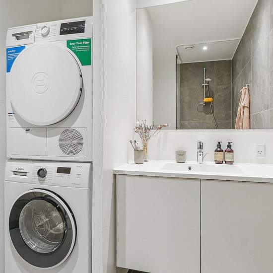 This modern 4-room apartment is located in the heart of Stigsborg – Nørresundby's new, attractive neighbourhood close to the fjord, green areas and Aalborg city centre. Here you get a home that combines functionality, comfort and a top-class location. The home comprises a bright living area with an open Invita kitchen and integrated appliances, three good bedrooms and a sleek bathroom with a stacked washer and dryer. Quality Moland wooden floors and underfloor heating in all rooms create an inviting atmosphere. From the living area there is...