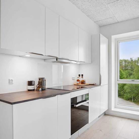 Lys og lækker lejlighed med et stort køkken-alrum, tre værelser, bad samt en altan. Det hyggelige og sammenhængende køkken-alrum forener både køkken, spiseplads og stue samt udgang til egen altan. Køkkenet er lyst og enkelt indrettet i nye kvalitetsmaterialer og indeholder alt i hårde hvidevarer. Køkkenet har desuden en moderne køkkenø, som indbyder til hyggelige stunder blandt lejlighedens beboere. Boligens soveværelse ligger i den ene ende af lejligheden, mens de to resterende værelser ligger i den modsatte ende. Du kan derfor med fordel i...