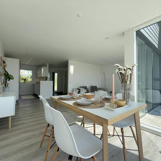 The area around Bølling Bakker in Horsens is known for its magnificent scenery with views of Dallerup and Purhøj. An ideal place for families. The apartment has an excellent layout and is available to rent at an attractive price. On the ground floor you will find a large open-plan kitchen and living area that feels like a ballroom, with plenty of counter space and ample storage in cabinets and drawers. The large windows in the living room fill the space with fantastic natural light. The apartment has two toilets — one on the ground floo...