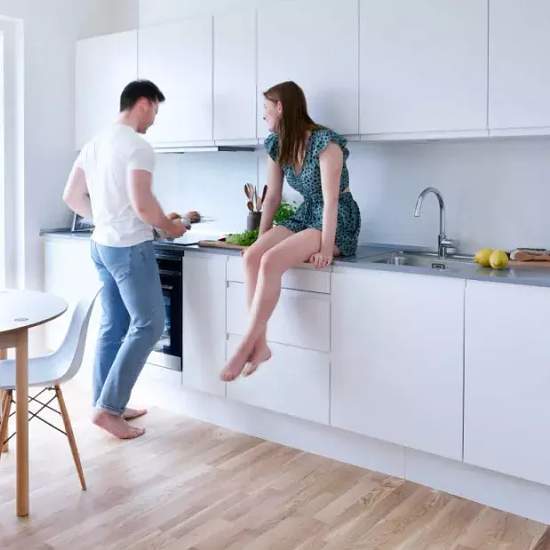 The apartment Four-room family apartment with access to a west-facing sunny balcony. Spacious living room connected to a modern white handleless Invita kitchen with grey CoreStone countertops and good cupboard space, as well as appliances from Gram, including a dishwasher. The bedroom is fitted with built-in wardrobes. The apartment also includes two lovely rooms. Spacious and inviting bathroom with beautiful dark tiles on the floor and in the shower area, as well as underfloor heating. Moulded sink, wall-hung toilet and a washer-dryer colum...