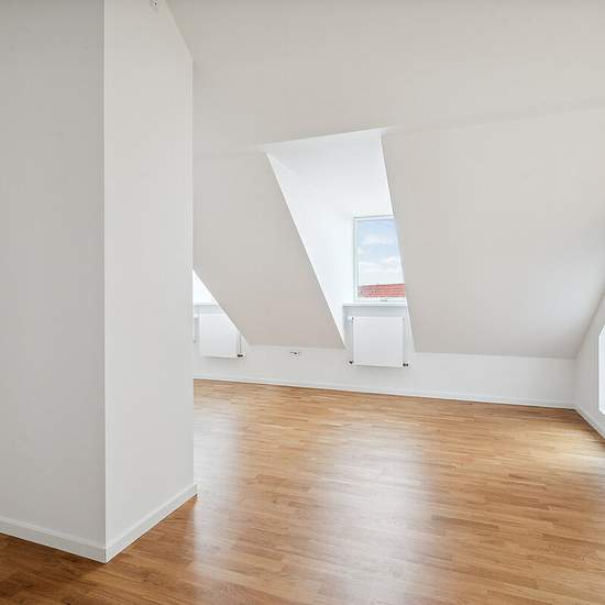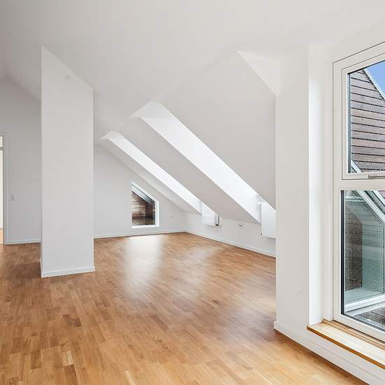 Newly established four-room penthouse apartment with an entrance hall, two bathrooms and a roof terrace. The apartment is fitted with sloping ceilings and vaulted ceilings in all rooms except the entrance hall. One of the apartment's two bathrooms, in addition to a shower enclosure, is equipped with its own washing machine and tumble dryer. The rooms and the bathroom feature dormer windows, which provide a good sense of space and plenty of natural light. The kitchen and bathroom are finished with white laminated surfaces. From the open-plan ...