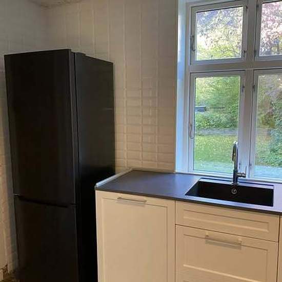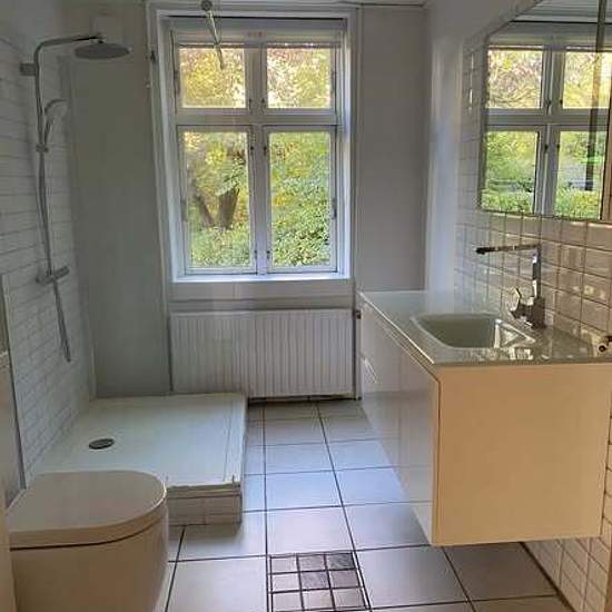 The apartment is 95 m2 plus a 19 m2 room in the basement, accessible from the living room. Laundry room in the basement. New fridge/freezer and oven. Planed wooden floors. Large, bright rooms. A shared garden with the upstairs neighbor and a parking space belong to the apartment. No pets allowed. Monthly rent 8,100 DKK. Estimated electricity/water/heating 1,400 DKK per month. Deposit 32,400 DKK. Feel free to send a private message for more info or more pictures.