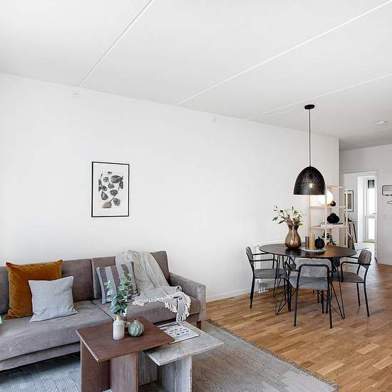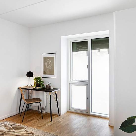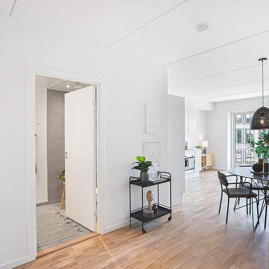 The apartment offers a functional and modern layout, with space optimally utilized. You enter into an entrance hall with plenty of room for outerwear and storage, from which there is access to the apartment’s other rooms. The residence contains three good rooms that can be used as a bedroom, children’s room or office depending on needs. The rooms are grouped together at one end of the apartment, which creates a natural separation between living areas and private rooms. The focal point of the apartment is the large, open living area with kitc...