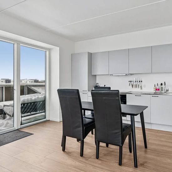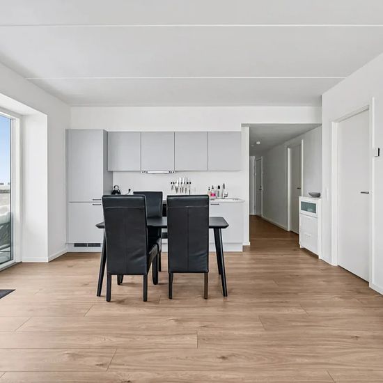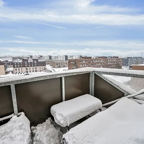 The apartment has a really good layout with three regular rooms and a large living area with an open-plan kitchen. The living room appears spacious and has beautiful natural light from the large windows. There is plenty of space for both a dining table and a sofa arrangement, and from the living room, there is direct access to the balcony, which offers a nice view of the area. The apartment contains three reasonably sized rooms that can be used as a bedroom, children's room, office, or guest room – depending on your needs. The bathroom is...
