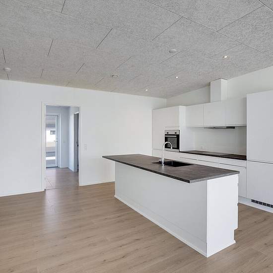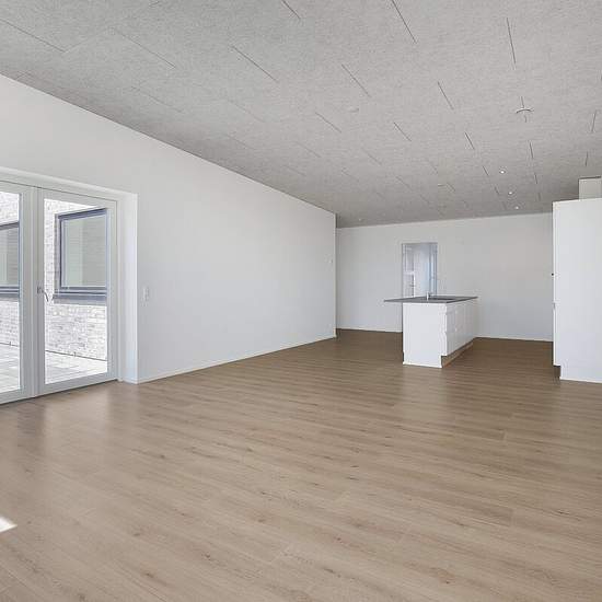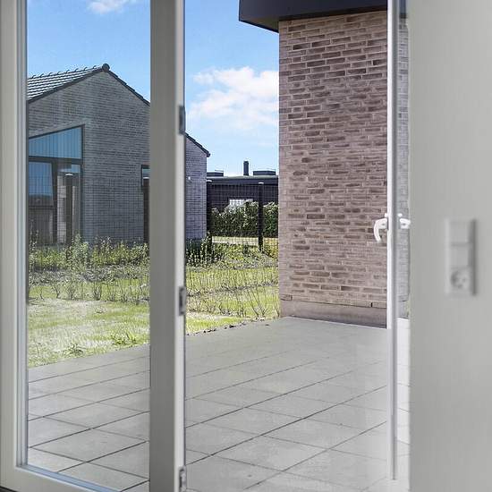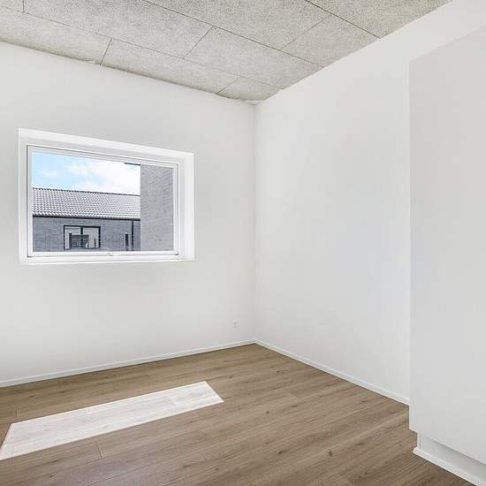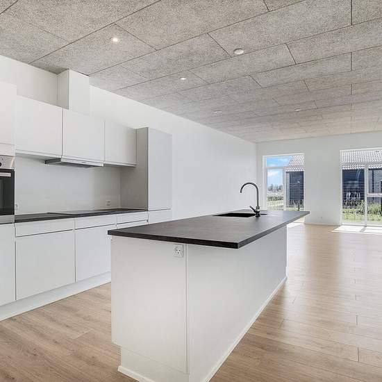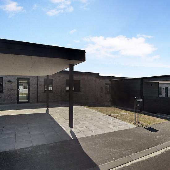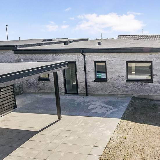 Exceptionally well-located end-terraced house from 2022. The property is built with good, solid quality materials - both outside and inside! Interior: This home is laid out with an entrance hall, utility room, open-plan kitchen-dining area and living room with access to a lovely terrace. Two bedrooms, a bathroom with shower and a master bedroom with its own bathroom, also with a shower. Underfloor heating throughout the property. Exterior: Manageable garden with lawn. Paved terraces and a double driveway with space for two cars. Carport of 2...