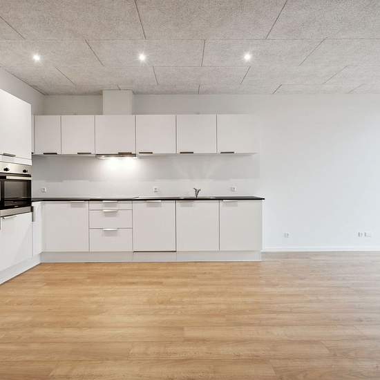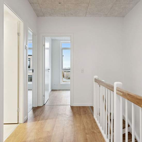 From the front door you step into the entrance hall of the single-storey terraced houses, where there is access to two separate rooms. You get a large kitchen-living room with either a kitchen island or an L-shaped kitchen. From the kitchen-living room there is access to a large bathroom with a stacked washer and dryer and the third room with built-in wardrobes. From the living room there is direct access to the home's tiled terrace, which is framed by a newly planted hedge. Inside the two-storey terraced houses you first enter the home's e...