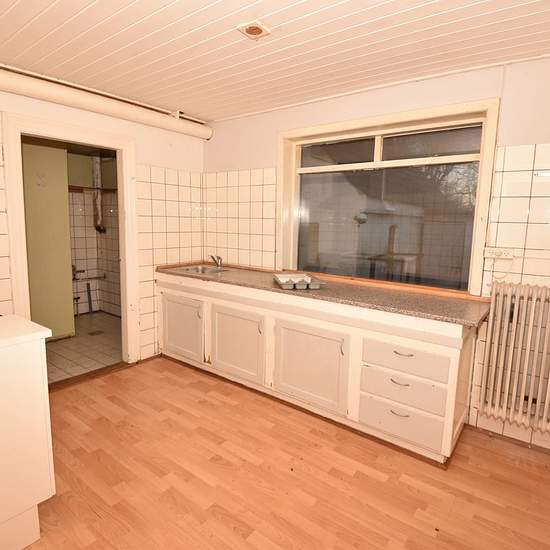 Centrally located house in Frøstrup with a secluded garden The property was built in 1939 in red brick with an asbestos-cement roof and plastic windows all around the ground floor. The property has a total living area of 113 m², divided into 68 m² on the ground floor and 45 m² on the first floor. The property includes a garage of 15 m² and an outbuilding of 18 m² with a chimney, wood-burning stove and a heating installation with a meter. The ground floor is laid out with an entrance hall, from which there is access to the first floor via...