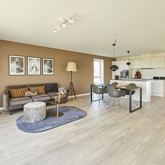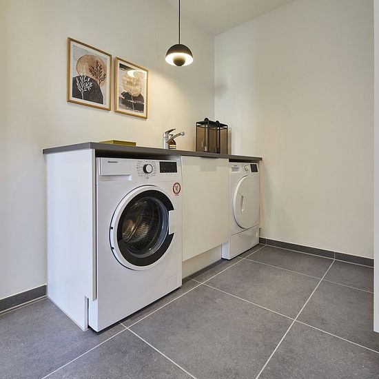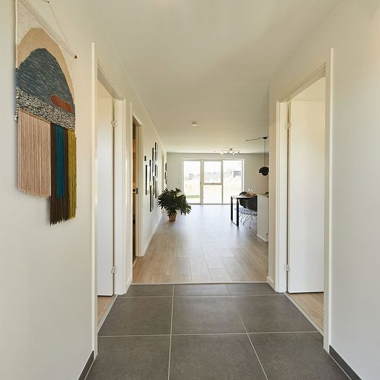 Modern and bright townhouse with plenty of natural light from large window sections. You step into a separate entrance hall with further access to two good rooms. From the entrance hall, you find the house's large living area with a bright kitchen and plenty of space for a dining table. There is also an opportunity to set up a cozy sofa corner. From the family room, you find a separate utility room with a sink and space for a washing machine and dryer, from where you reach a large modern bathroom. Additionally, there is a bedroom with a buil...