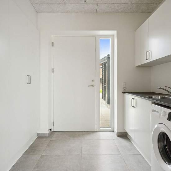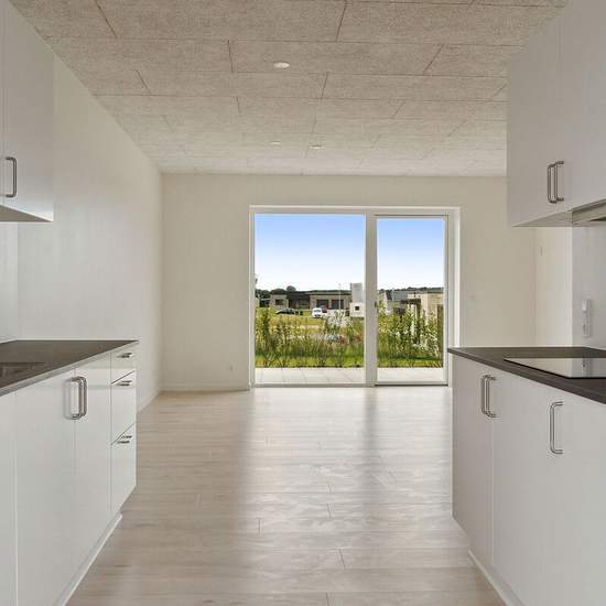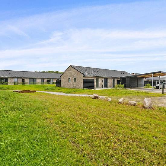 Note: It is a requirement that tenants for this rental are 55+ years old and have no children living at home. All the terraced houses are single-storey. You step into an entrance hall tiled with ceramic tiles. Here you will find a washing machine and dryer as well as plenty of cupboard space and a countertop with a sink. There is a large, bright kitchen-dining area with space for a living area. The bathroom has light fixtures, a separate shower cubicle and a cabinet. Depending on the size of the home, there are 2 or 3 rooms. One of the room...
