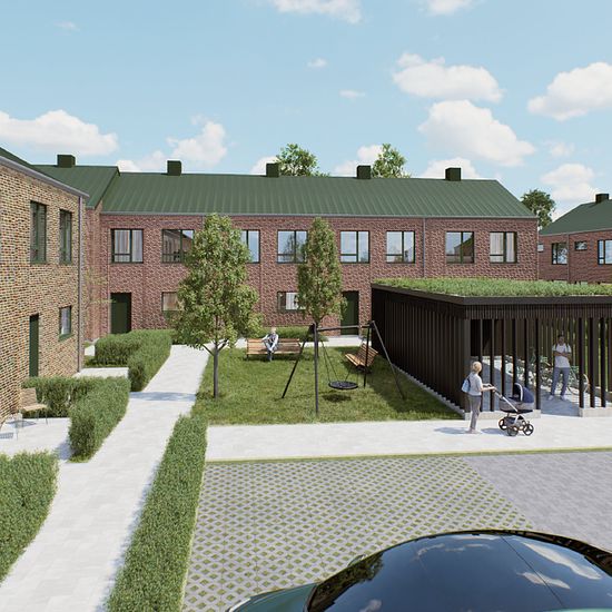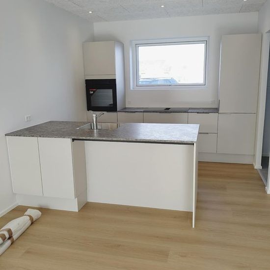Newly built terraced houses close to town and nature. 109 m² incl. loft spaces The newly built terraced houses welcome you into a bright and inviting entrance hall with practical built-in storage. From the entrance you step into a stylish kitchen from DESIGNA, which is open to the living room. From the living area there is direct access to a private garden with a lovely terrace – ideal for relaxation and outdoor living. On the ground floor you will also find the property's first WC. On the 1st floor there is a spacious bedroom with good c...