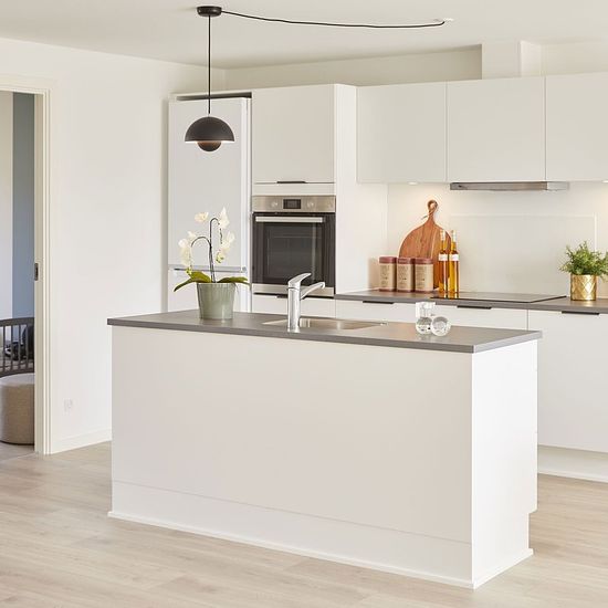 From the house entrance, there is further access to the large kitchen-living room combined. Here, there is plenty of natural light through large floor-to-ceiling window sections, as well as access to the house’s two terraces on each side of the property. The modern kitchen is placed in the center of the room, allowing you to be with the rest of the family while standing in the kitchen. There are many possibilities for arranging a cozy living room and dining nook. From the dining area, there is further access to two bedrooms, a large master b...