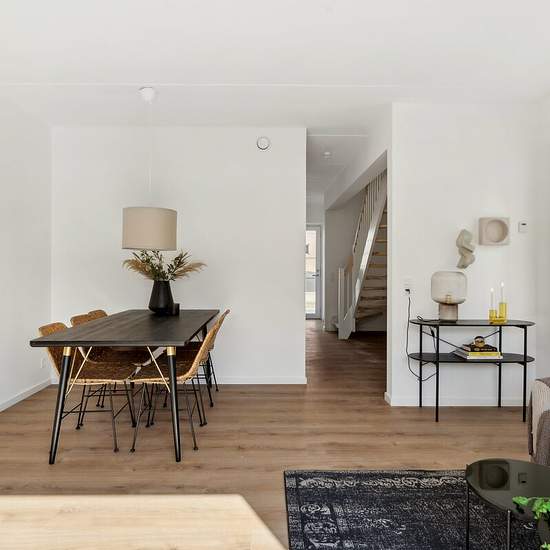 Modern townhouse with space for the family We are pleased to offer this large 2-story townhouse built with quality materials. The home features many generous square meters, which are distributed over an entrance hall, a separate kitchen equipped with all major appliances and elements from Designa. From the hallway, you will find access to the fully utilized first floor, which boasts three spacious bedrooms. The bedrooms come with built-in wardrobes and the possibility of establishing a walk-in closet. On the first floor, you will also find ...