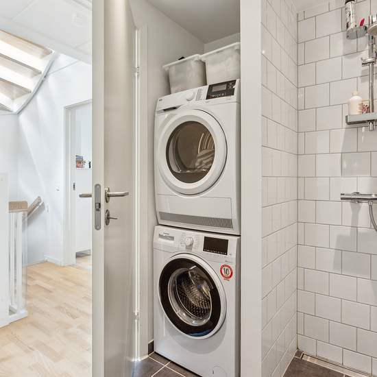Modern 4-room terraced house with roof terrace This beautiful, modern three-story terraced house offers on the ground floor a large open-plan kitchen/dining area and living room with access to a lovely terrace. The modern kitchen is equipped with a fridge-freezer, hob, built-in oven, extractor hood and dishwasher. The first floor offers three good bedrooms as well as access to a balcony. Both on the ground floor and the first floor there is a modern bathroom, and the first floor has a stacked washer and dryer. On the top floor there is a lar...