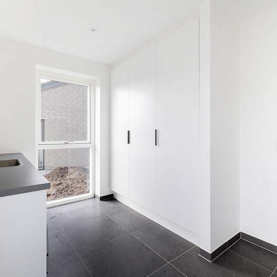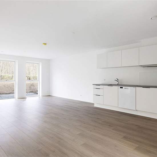 Please note: It is a requirement that tenants of this rental are 55 years or older and have no children living at home. You enter the home's utility room, where you'll find a washing machine and tumble dryer. The home has a large kitchen-dining area open to the living room, from which there is access to the terrace and the small garden. The bathroom is spacious with a shower enclosure and a bathroom vanity unit with mirror. The terraced house has two separate rooms and one larger bedroom with built-in wardrobes. All homes have their own out...