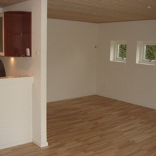 Lovely detached single-family house located in Sdr. Rind. The house consists of a living room, kitchen/dining area, bedroom with wardrobes, two rooms with wardrobes, bathroom, utility room, and entrance hall. It is equipped with all major appliances, including a dishwasher, washing machine, dryer, etc. There are wooden floors in the living room, carpets in the rooms, and tiles in the remaining parts of the house. The property also includes an integrated carport, a large insulated tool shed, and a garden.