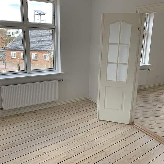 Newly renovated 5-room apartment of 115 m2 with a cozy balcony facing a quiet courtyard. The apartment is centrally located in Brande, about 100 meters from the pedestrian street and opposite the station. The entire apartment was completely renovated in 2019. The kitchen has an integrated dishwasher and fridge/freezer. There is also the possibility to install your own washing machine and tumble dryer. The hallway, kitchen and bathroom have light gray tiled floors with underfloor heating. In all three areas it is possible to independently...