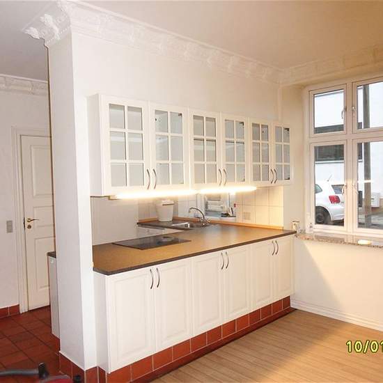 Large 5-room ground-floor apartment, completely renovated a few years ago. It has 2 living rooms and 3 bedrooms, 2 bathrooms, a large hall/entrance and a storage room. Beautiful stucco ceilings in all rooms. Large terrace facing the courtyard. Parking in the courtyard. Located 200 m from the harbor in Hobro.