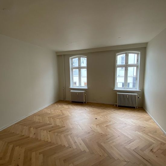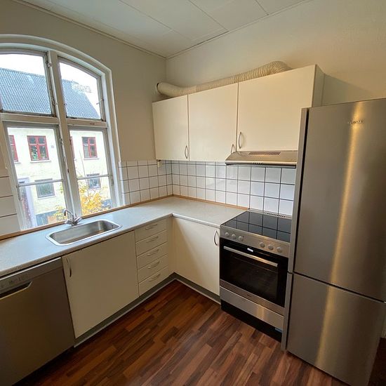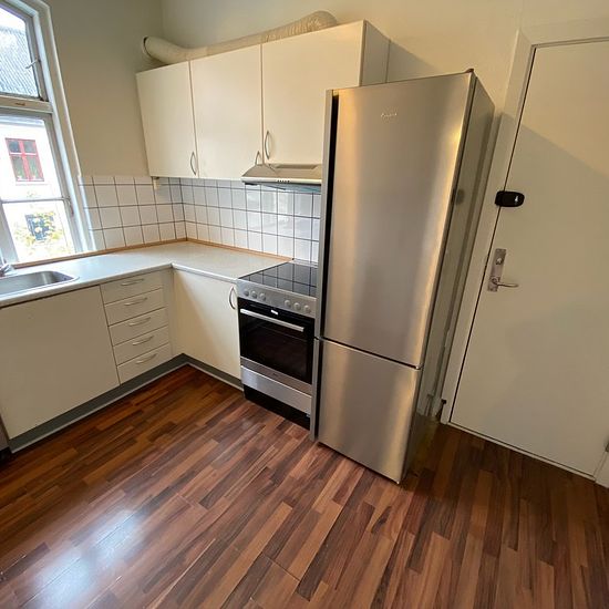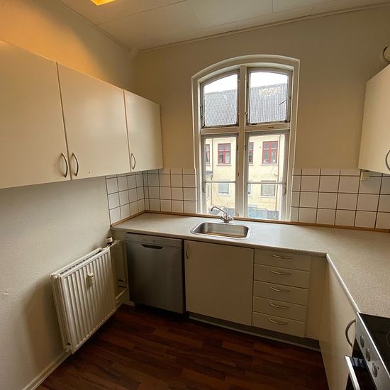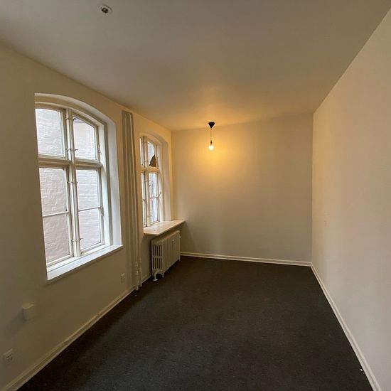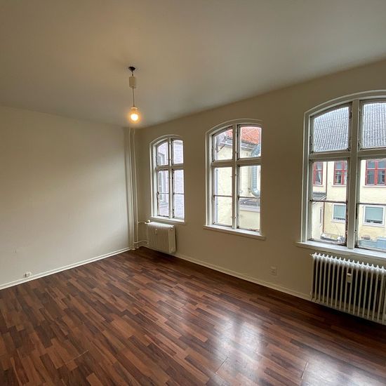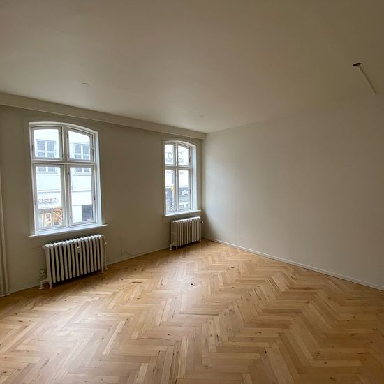 If you are looking for a large shared apartment – then this one is it! The apartment is located in Vestergade and is arranged with an entrance hall, kitchen, bathroom, living room, and 5 spacious rooms. It is situated on the entire 1st floor, so you have no neighbors on the sides in the stairwell. The apartment is divided into 2 sections with separate doors. To the right in the stairwell there are 2 rooms, one of which is a walk-through room. To the left in the stairwell there is an entrance/hallway, living room, kitchen, bathroom, and 3 lar...