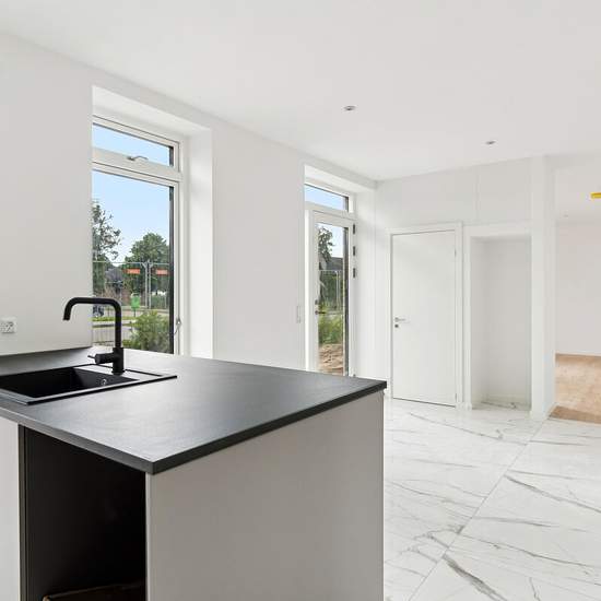Rækkehusene er placeret på en lukket sidevej omgivet af naturområder og stier. Hver bolig har en privat have, tagterrasse og parkeringsplads. Velkommen til dette 5-værelses rækkehus. Her træder du ind i det lyse køkken/alrum, hvor der både er plads til sko og overtøj. Køkkenet er med god skabsplads samt en stor køkken-Ø. Her er der fin plads til spisebord. Videre træder du ind i stuen, hvor der er god plads til sofaarrangement. Lyset strømmer ind af de store vinduespartier. Derudover er det ene af boligens toilet/bryggers, hvor du har vaskem...