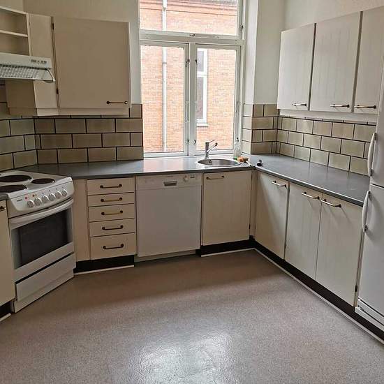 Large 5-room apartment with a super central location The apartment consists of 3 large, easy-to-furnish rooms, 2 connected living rooms, a lovely large kitchen with a bright layout and plenty of cupboard space, and a large bathroom with a washer/dryer unit. The apartment has two balconies, one of which offers a truly fantastic view over Hjultorvet, where Viborg regularly creates wonderful settings for great experiences. A more central location cannot be found. You have all the city's offerings right outside your front door – great cafés, ...