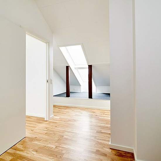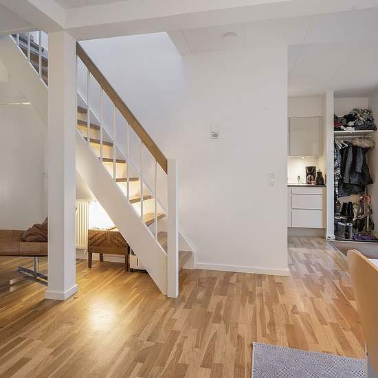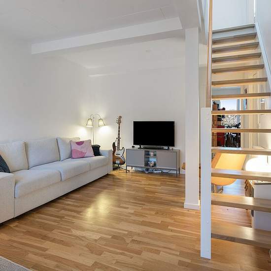 The apartment has an open kitchen-living area with stairs from the ground floor to the first floor. The kitchen is fitted with a white HTH kitchen and AEG appliances, such as a dishwasher, fridge-freezer, noise-reducing extractor hood, oven and induction hob. The bedroom has built-in wardrobe space, and the bathroom has underfloor heating and a washer-dryer stack. The property has an elevator, free parking and covered bicycle parking, a storage room and is a short distance from shopping and transport options.