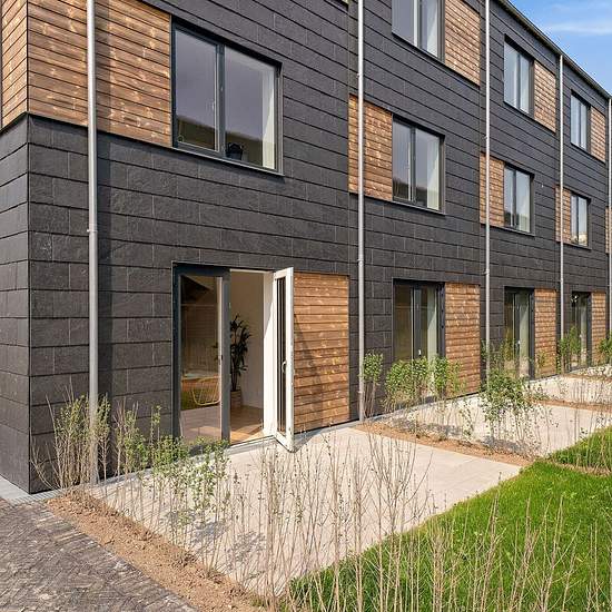 The homes are laid out over three floors. On the ground floor you will find a guest toilet and the lovely kitchen, which is open to the bright dining room. From here there is direct access to the home's terrace. On the first floor there is a living room and a large bedroom. On the second floor are the home's bathroom and two bedrooms. In front of the terraced house you will find a front garden with a shed ideal for bicycles or a stroller. In the back garden you have a large paved terrace as well as a lawn enclosed by a hedge. Appliances Al...
