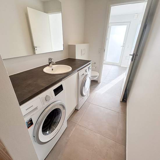 This terraced house is wonderfully spacious and has everything you could wish for. It is spread over two levels. There is both a terrace and a balcony. Downstairs we have a lovely entrance hall, two rooms, the kitchen and a bathroom with a washing machine and dryer. There are large windows that let in plenty of light. The rooms have access to the terrace. Upstairs we have the bedroom, a bathroom and an open living area, which also has large windows and access to the balcony. There is also an extra room. There is a carport and a shed. Advanc...