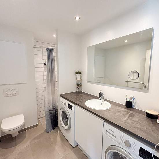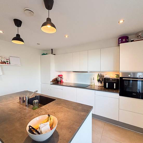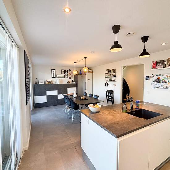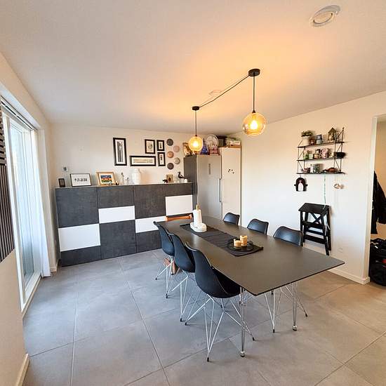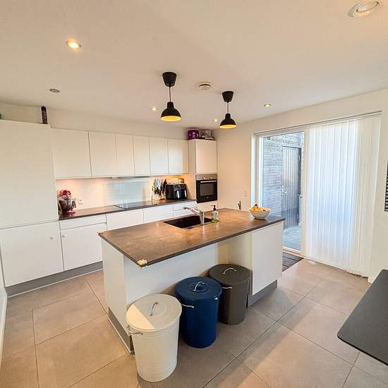 Welcome to this inviting terraced house from 2017, built using modern, high-quality materials. The property is arranged over two levels and offers a functional layout with room for the whole family. On the ground floor you step into a spacious entrance hall that provides access to two bright rooms, both with built-in wardrobes. The large bathroom is stylishly fitted with good storage, a practical shower area, and both a washing machine and a tumble dryer. The heart of the home is the open-plan kitchen and dining area, where the elegant whit...