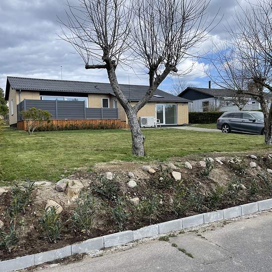 Description Completely newly renovated property with an air/water heat pump and underfloor heating throughout the house. From the front door, you enter the hallway with three spacious rooms on the right side. On the left side: a large room with its own exit, access to a lovely bathroom, and to a utility room with good storage space and a washing machine. At the end, you step into the bright living room, which is connected to a nice kitchen and has access to a larger south-facing terrace. The garden is practical with grass, and in the back...
