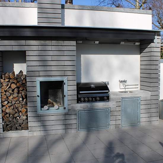 The villa was built in 2017 and comprises three usable levels. On the ground floor there is a very attractive kitchen/dining area with lots of glass facing the garden and a huge terrace area with an outdoor kitchen and an outdoor fireplace. The kitchen has everything the heart could desire, including three ovens, a built-in coffee machine, a wine cooler, a Quooker and an American-style refrigerator. From the dining area you reach the house’s living room, with large glass panels overlooking the lovely garden and green areas, and the path sys...