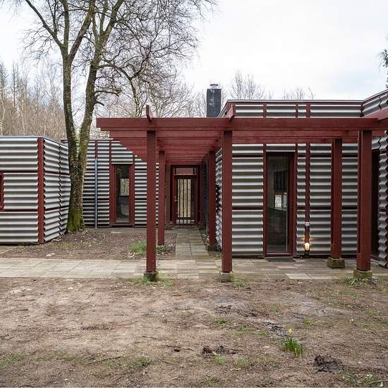 All photos by architectural photographer Helene Høyer Mikkelsen. Herning / Arnborg Picturesque location directly on the Skjern River and the Dalgas Canal, situated on approximately 33,000 sqm of completely secluded woodland property where biodiversity flourishes. Summer house or year-round residence. Poul Erik Thyrring’s own house in the midst of the beautiful nature with the finest view of the River and Canal, set in an undisturbed forest area. The house was built in several stages in a style that can be described as “Flower Brutalism” – he...