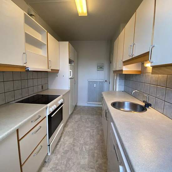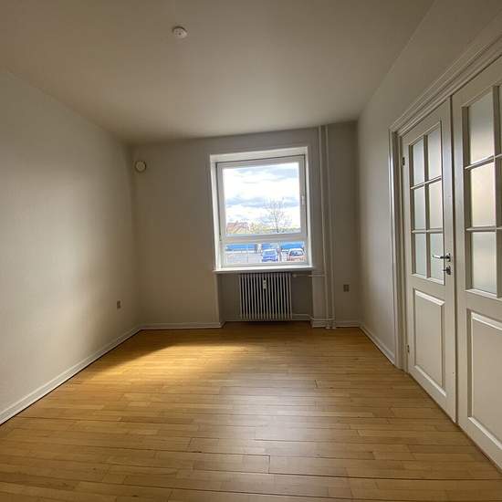3-room apartment in the center of Silkeborg. The apartment includes: Large entrance hall with built-in cupboards, Living room with French glass doors to the dining room, Bedroom with cupboards, Kitchen with many cupboards, refrigerator, stove, dishwasher, etc. Newly renovated bathroom with a shower cubicle. The apartment is newly painted and has newly lacquered hardwood floors. Good location close to the train station and bus station. Parking available in the parking garage for DKK 326 per month.