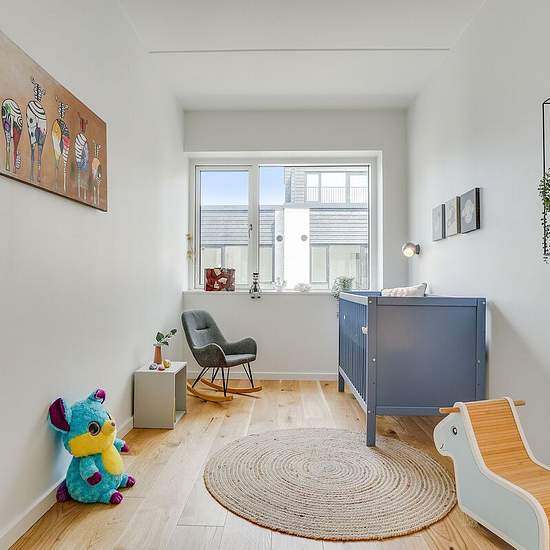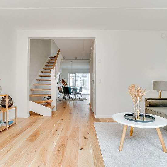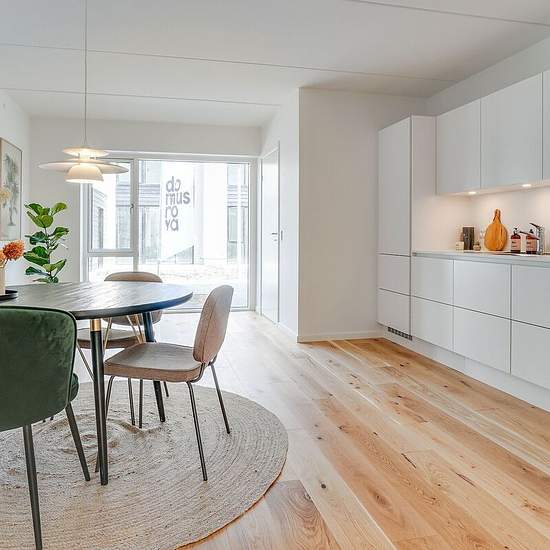 Welcome to Lykkens Minde! Here you will find a very nice two-storey terraced house with an unlimited lease term. On the ground floor there is an entrance, a kitchen and a living room in an open layout, as well as a shower bathroom. The kitchen is a handleless HTH kitchen and the floor is light oak. On the first floor there is a large bedroom plus two slightly smaller ones and another shower bathroom. This bathroom has both a washing machine and a tumble dryer. The property has its own terrace and a 4 m² garden shed. Furthermore, it is possib...