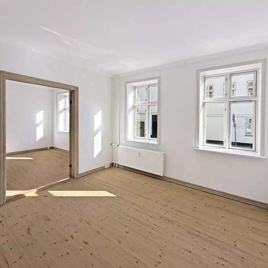 Cozy 3-room apartment located on Valdemarsgade, 9000 Aalborg. The rental is situated close to green areas, the marina, and the café and city life in Aalborg's city centre. Grocery stores, public transport and the train station are right outside the door. The apartment consists of a large, newer open-plan kitchen-living area with the possibility to install a dishwasher. In addition, it has two living rooms en suite with French doors, a good bedroom with built-in wardrobes, and a large bathroom with a separate shower. The property includes ...