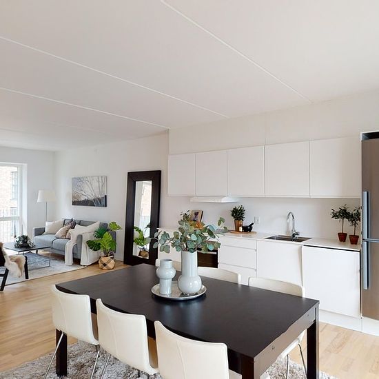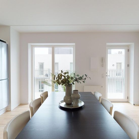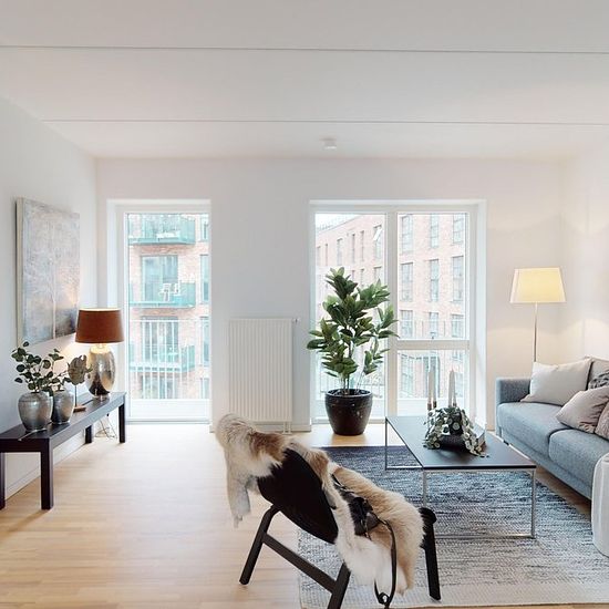 This lovely apartment located on Glostervej in Valby comprises a total of 95 sqm, distributed over an entrance hall, bathroom, a large kitchen-living room, a walk-in closet, a storage room, and two bedrooms. The rental is designed with large wide windows that contribute to the bright and inviting appearance of the apartment. The exclusive construction in Filippahaven consists of 3 blocks and offers 83 modern rental units. Here you will find spacious 3 and 4-room apartments varying in size from 77 to 157 sqm. The apartments feature classic wh...