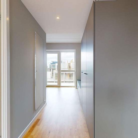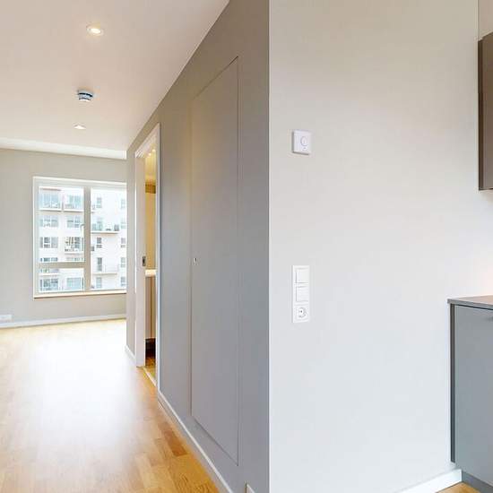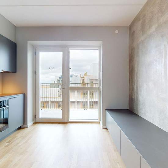 The apartment: In this apartment you enter into a spacious kitchen; the kitchen comes with all major appliances and built-in cabinets for storage. From here you’ll find the bathroom on your right; it is spacious and bright with a shower niche and includes a washer-dryer combo. The apartment is finished to a high standard, with wooden floors, beautiful kitchens from Rotpunkt, underfloor heating and an urban modern look! The property: Norden has 193 high-quality studios. The building also offers a wealth of facilities, for example access to r...