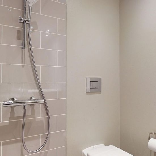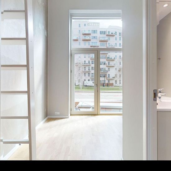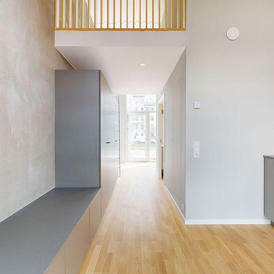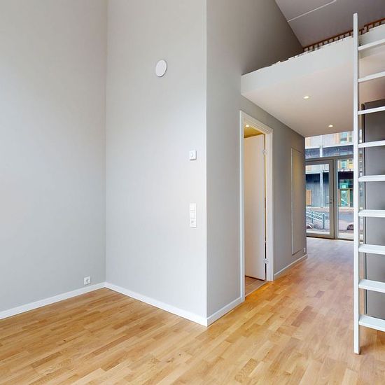 The apartment: In this home you step into the apartment’s kitchen; the kitchen comes with all major appliances and built-in storage cupboards, and there is also space for a small dining table. From here you’ll find the bathroom on the left — it is spacious and bright with a shower niche and includes a combined washer/dryer. From there you enter the living room, which offers plenty of space for a sofa arrangement and also has several built-in cupboards. In addition, this apartment has a mezzanine where there is room for a bed. The property: ...