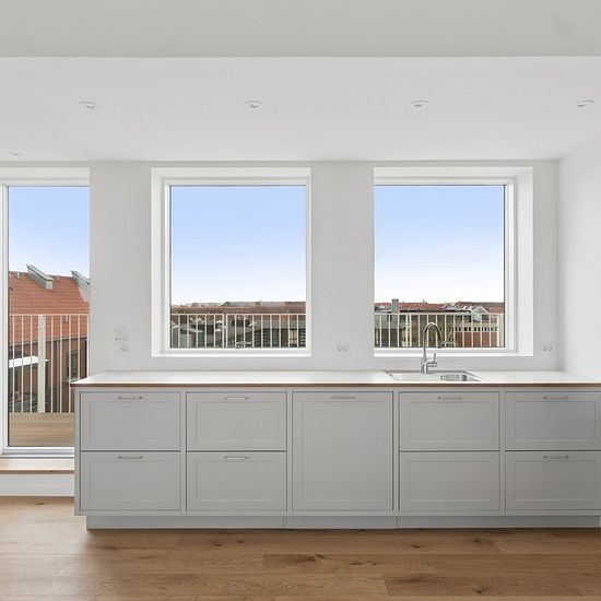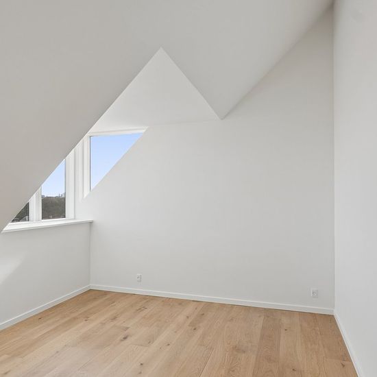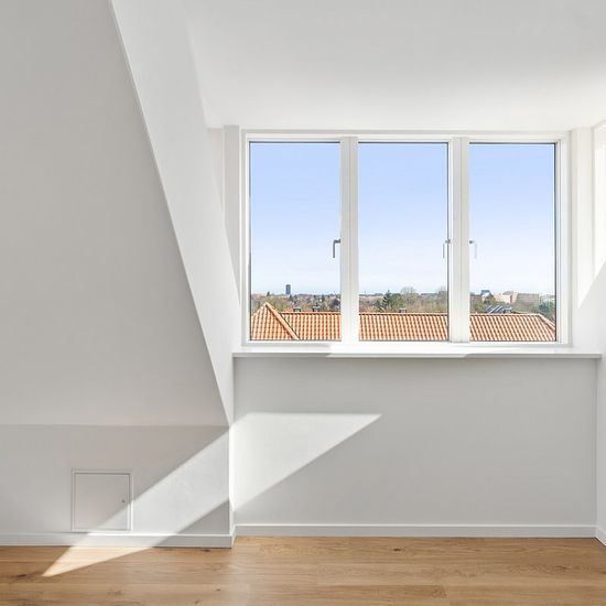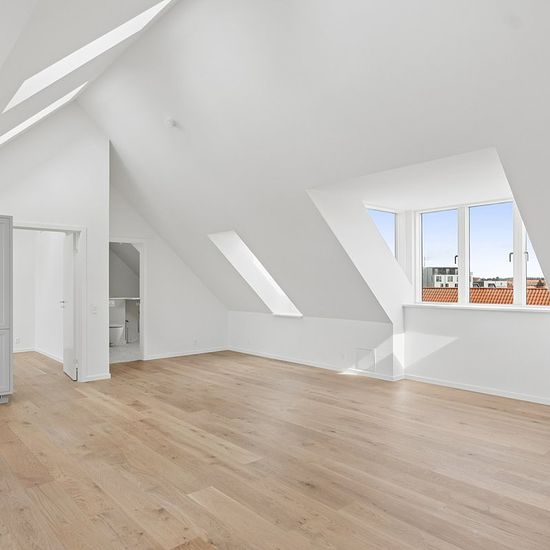 Welcome to a rarely offered property on Jernbane Allé in the heart of Vanløse. Here you get a modern and inviting apartment with a very special atmosphere, where vaulted ceilings and large window sections create fantastic natural light and a spacious feeling. The residence offers an open and bright kitchen living area, good bedrooms, and a private roof terrace where you can enjoy the view over the area. There is space for both relaxing in the sun and cozy evenings with friends and family. The location is top-notch – you live centrally in Van...