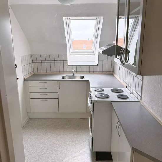 Welcome to an inviting 2-room apartment of 54 m2 on the top floor of the building, where sloping walls, dormer windows and a pleasant influx of light create a cozy atmosphere. The layout is simple and functional with an entrance hall, living room, bedroom, separate kitchen and bathroom. The entrance provides space for outerwear as well as a door phone and practical shelves. The living room is bright and easy to furnish, with light wooden floors, white-painted walls and a calm view over the red tiled roofs – a pleasant space for both seating...