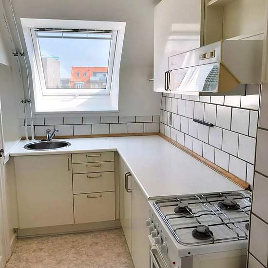 Welcome to a well-appointed 2-room apartment of 47 m2 at the top of the building. Here you get a bright home with classic details, attractive plank floors and sloping walls that create cozy corners — ideal for someone who wants to live practically and charmingly on a few well-used square metres. The apartment features an entrance hall with space for shoes and coats and leads on to a proper living room with lovely light from a dormer. There is plenty of wall space for a sofa, shelving and a small dining table. The bedroom is well-proportione...