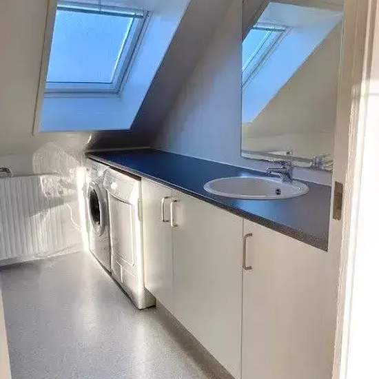 Welcome to an inviting and well-maintained attic apartment where sloping walls, skylights and dark exposed beams create a warm, characterful atmosphere. The layout is simple and everyday-friendly with an open living area, making the home ideal for both singles and couples who want a bright home with good functionality. The kitchen is open to the living room and features white units with ample counter and cupboard space. There is a built-in oven, hob, extractor hood and a tall fridge/freezer – everything you need in a compact, practical sett...