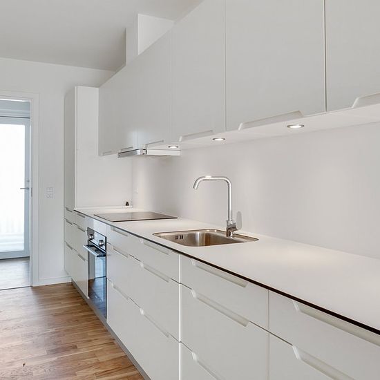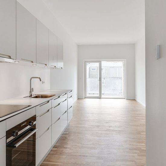 Beautiful apartment designed with high ceilings. They have beautiful oak parquet floors with underfloor heating, perfect for style-conscious parents of young children. Here you get the warm look of wood along with a practical and maintenance-free floor where jam stains can easily be wiped off with a cloth. All homes are furnished with the well-known and modern Invita Urban kitchen and fittings from Hans Grohe, known for classic, long-lasting design. There are beautiful white and simple surfaces with clean lines. Drawers and doors feature sof...