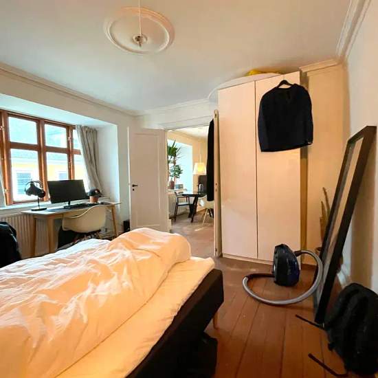 Experience an inviting and bright 3-room apartment of 69 m², perfectly located in a sought-after neighborhood in Aalborg C. The apartment offers three bright rooms with wooden floors and large windows that ensure plenty of natural light. The kitchen has cabinet space and good countertop space. The bathroom is fitted with light tiles. The apartment is suitable for sharing, as there is the option to close off one of the living rooms, thereby creating a bedroom. The location offers easy access to cafés and green areas. Public transport is al...