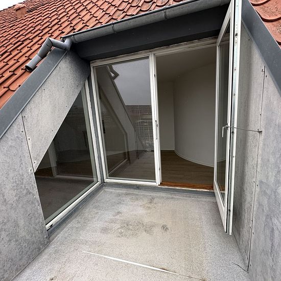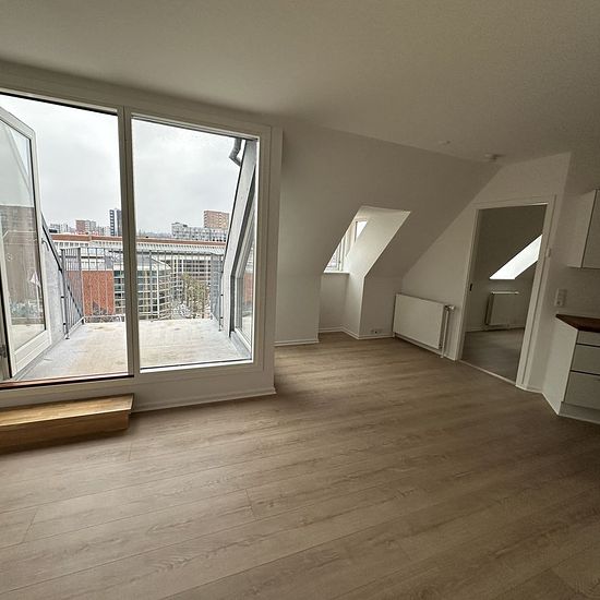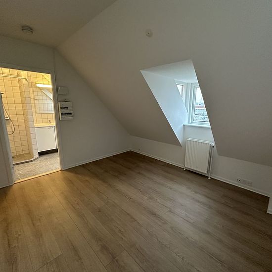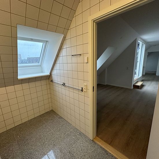 This beautiful bright attic apartment, with an intercom, has its own lovely built-in rooftop terrace. Here you can sit undisturbed and enjoy the view over the Town Hall Square. To the left of the entrance is the rental unit's toilet. The bathroom is actually divided into two rooms. Continuing into the living room, you will find on the right-hand side the spacious bathroom, where there is room to install your own washer/dryer. From the bright living room, you can access the terrace as well as the charming kitchen, with beautiful dark woode...