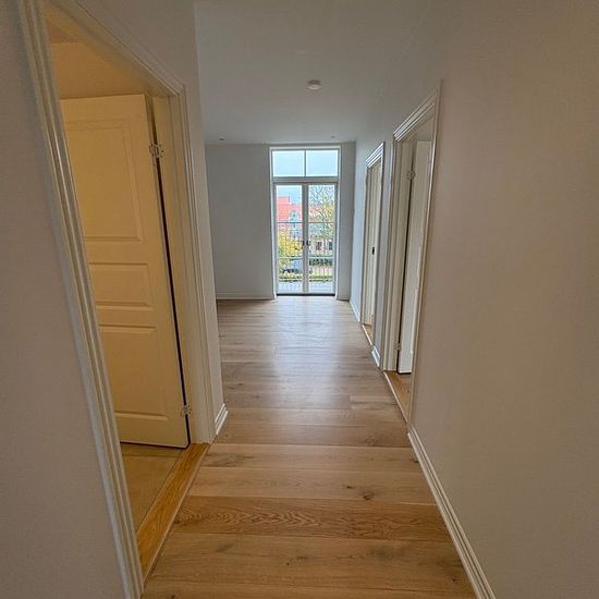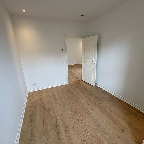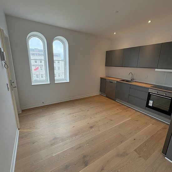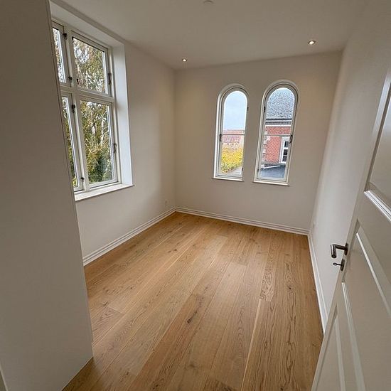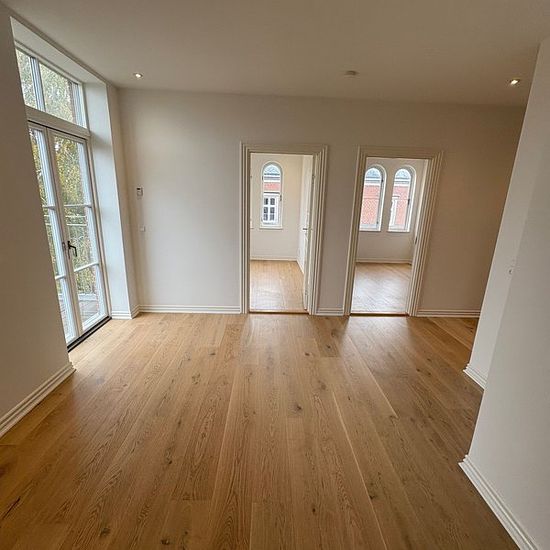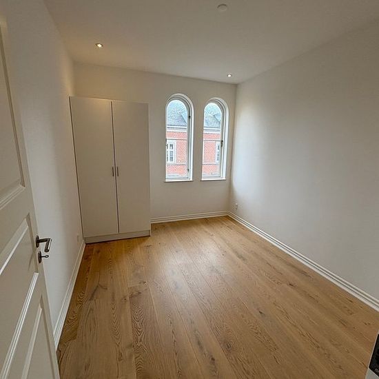 In our beautiful manor property located on Oldenborggade, you will find this gem. Completely newly renovated apartment in a worthy-of-preservation building. The apartment includes: Bathroom with washing/drying machine, lovely kitchen with all appliances in open connection with the living room, 2 good bedrooms as well as access to a lovely balcony and basement storage. The apartment has underfloor heating and a ventilation system. Lovely apartment with a great location close to the harbor. On the property, there is a green area with a foun...