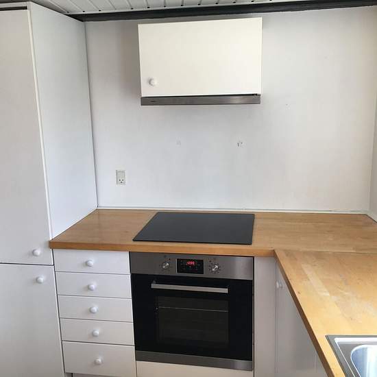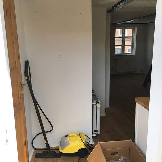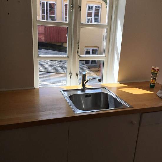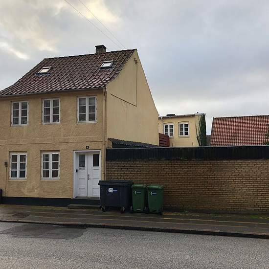 Lovely and cozy two-room apartment on Østergade in Haderslev. Includes a bedroom on the first floor, a bathroom, a living room, and a lovely kitchen. Pets only by arrangement.